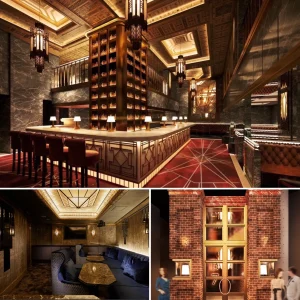 アールデコスタイルを現代に蘇らせた内装で、豪華で細部までこだわり抜かれた装飾は当時の華やかな社交シーンを彷彿とさせ、黄金色の照明とダークウッドの使用は、高級感と暖かさを同時に提供し、エレガントな雰囲気を強調。幾何学模様のカーペットや壁面の装飾、クラシックなシャンデリアは、古き良き時代のロマンスと豪華さを現代の六本木に持ち込むコンセプトを表現しております。