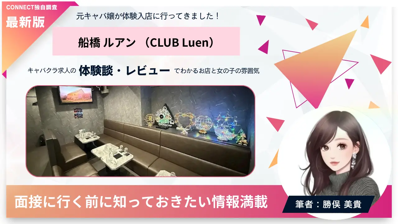 実際に「船橋ルアン(CLUB Luen)」へ面接・体験入店して初めて気づいたお店の特徴や、良い点・悪い点の両方から忖度抜きで正直レビューします!口コミや評判だけでは分からないリアルな情報をお届けするので、船橋でキャバクラ求人を探している方はぜひ参考にしてくださいね♡